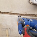 Le perçage du mur se fait avec une mèche de 12mm adapté à la pierre. J’y introduis par la suite la tige filetée (les 2 tiers de celle-ci) avec le scellement chimique.